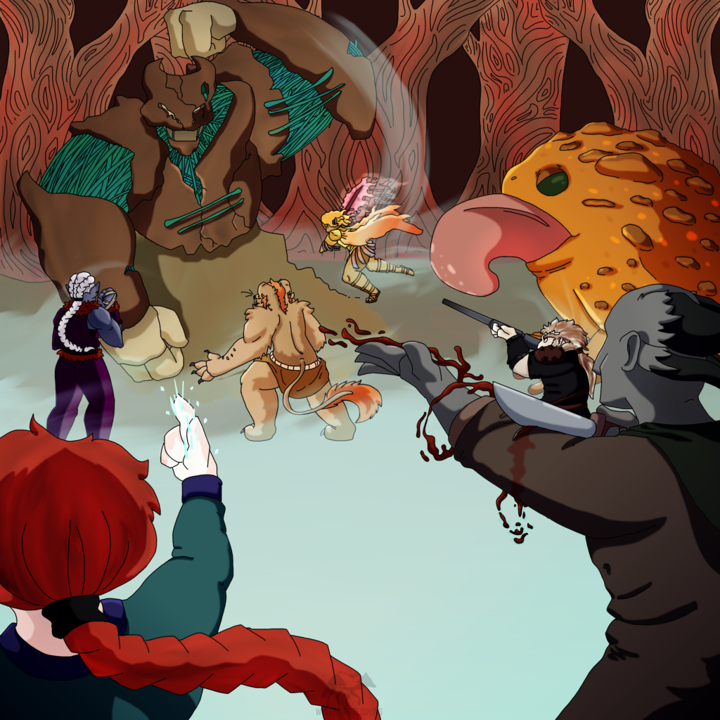 Massani was not fast enough. A curse that haunted her steps with each stride, a failure that cost her family. That cost her people their pride. The ground swallowed up her ankles, locking them with a grip like the hands of her dead, pulling her deeper, pulling her closer. She lashed out, her claws scraping against rock but offering no purchase. She snarled, wishing she could shout, roar, growl–anything to keep its attention. A glance at those she traveled with brought with it blood-soaked clothes, bleeding gashes, black eyes and blooming bruises. By the time her eyes moved back to her opponent, he once more smashed the ground.