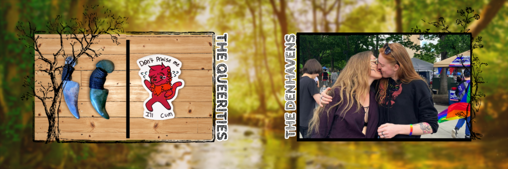 We’re Lauren and Leora. We met in 2021 on the HER app, and after our first date resulted in us being kicked out of the coffee shop we were in (we stayed until after closing… sorry!), we began the lesbian tradition of long dates that lasted entire weekends at one another’s place. We got engaged on February 4th, 2023. Both of us being the creative sort and always crafting or making things during our time dating, we decided to combine forces and open up a small shop together. DenHaven, a name combined from “The Den,” the name of our future home, and “Haven,” the name of my self-built tiny house, was suggested by Leora as a potential last name for the two of us, and I (Lauren) simply fell in love with it. I’ve taken it upon myself to use it wherever I can.