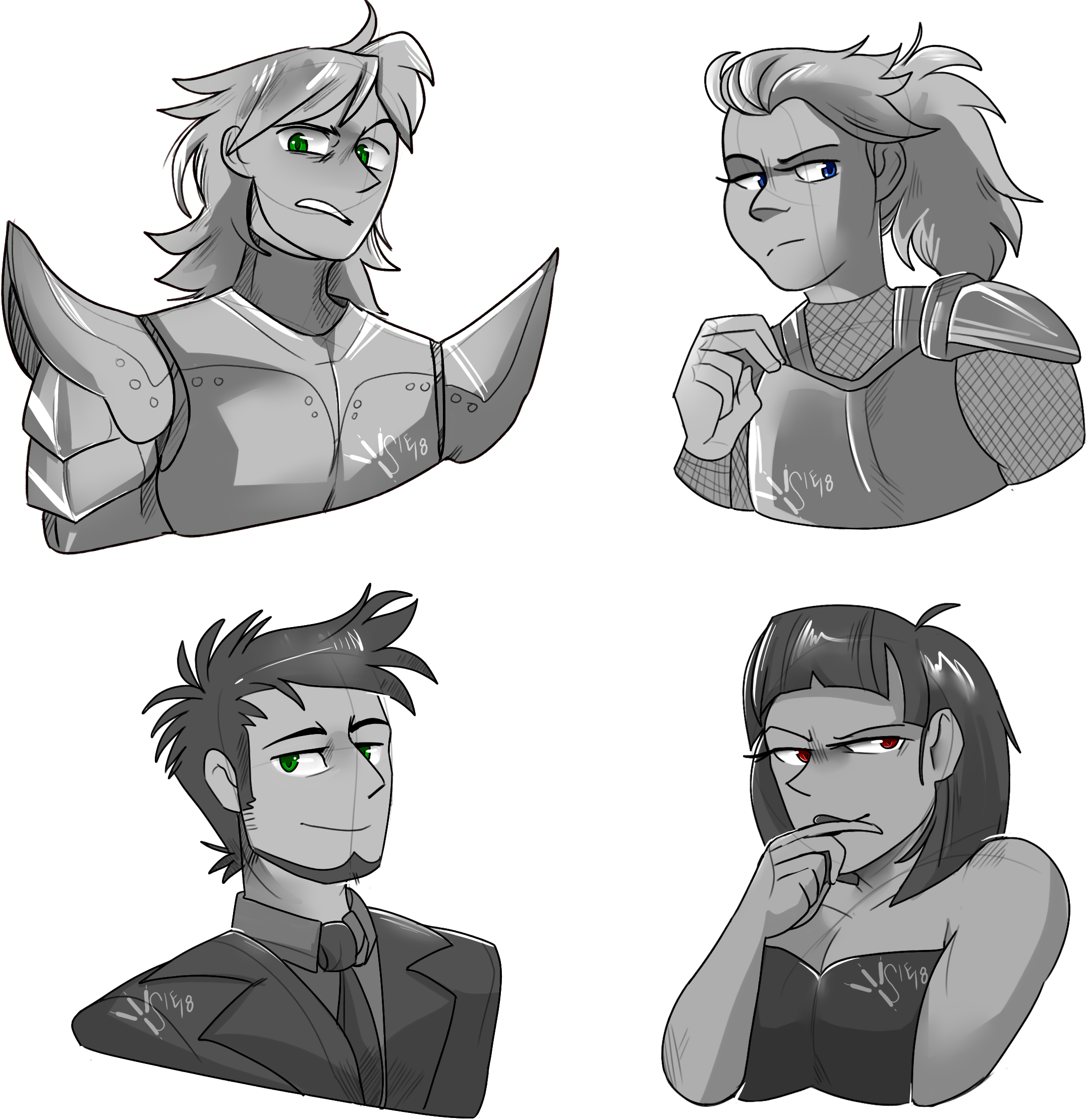Headshots of Jade, Aris, Thaddeous, and A’doxia from Viridis. https://www.deviantart.com/siechy/